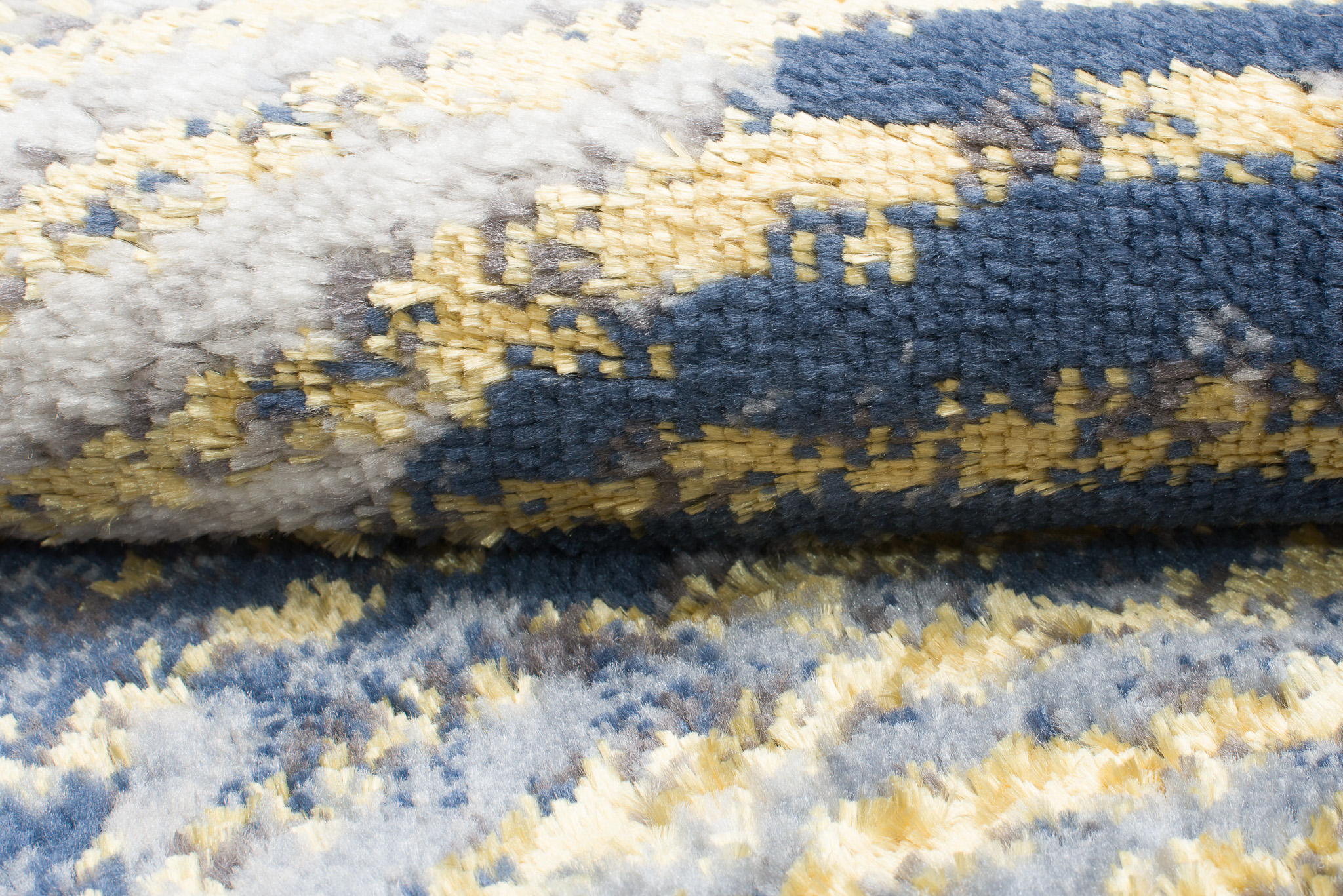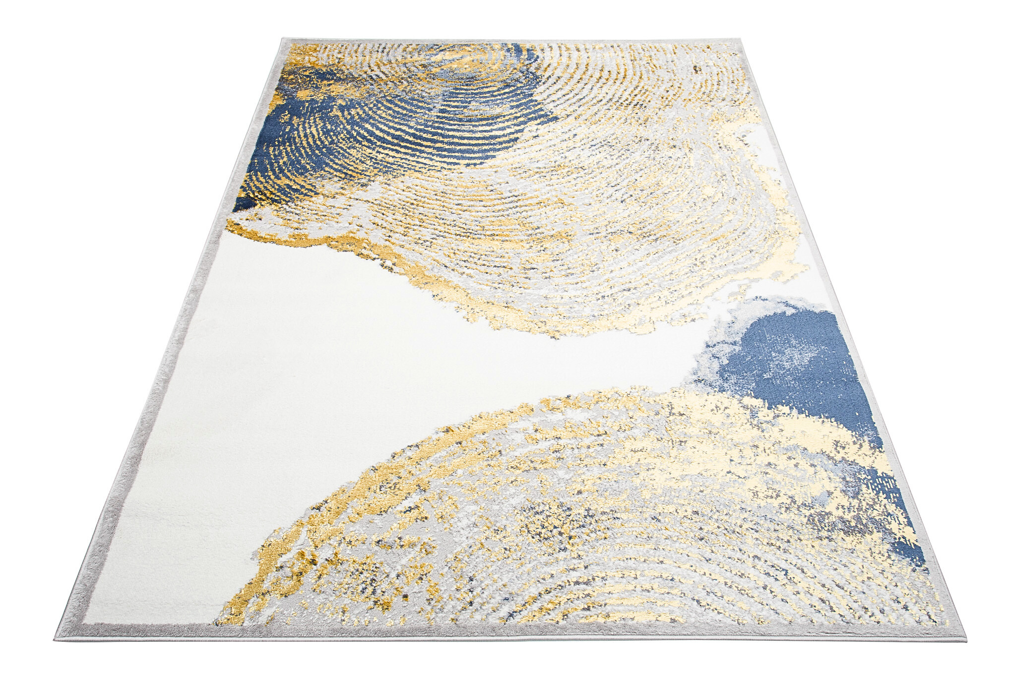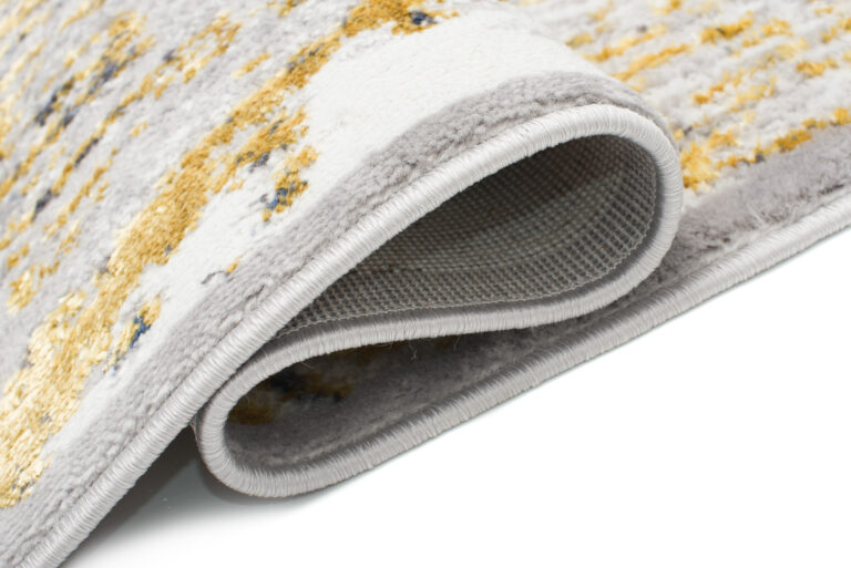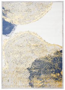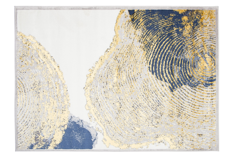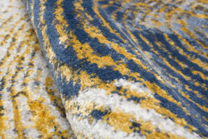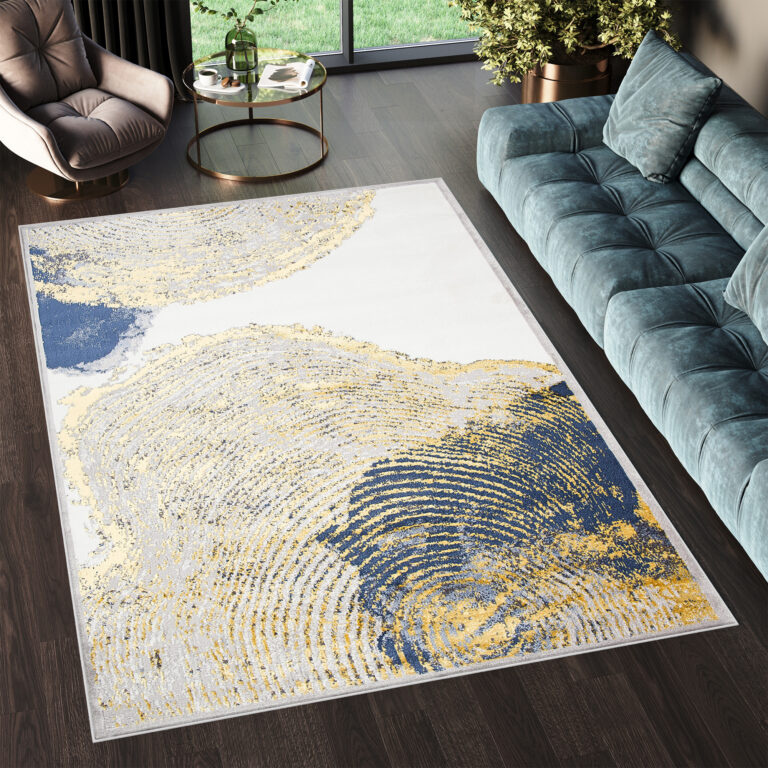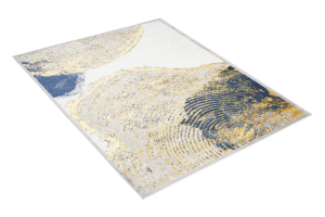 Ce qui distingue cette collection des autres, ce sont des motifs abstraits et un subtil fil doré qui ajoute un éclat unique aux tapis. Les couleurs dominantes de la collection sont le gris profond, l’élégant bleu marine et l’or luxueux, qui se combinent harmonieusement les uns avec les autres, créant un effet visuel accrocheur.